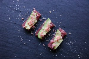 TheGoodGreeff Tuna Sashimi with Wasabi Avocado Chopped Ginger and Smoked Salt