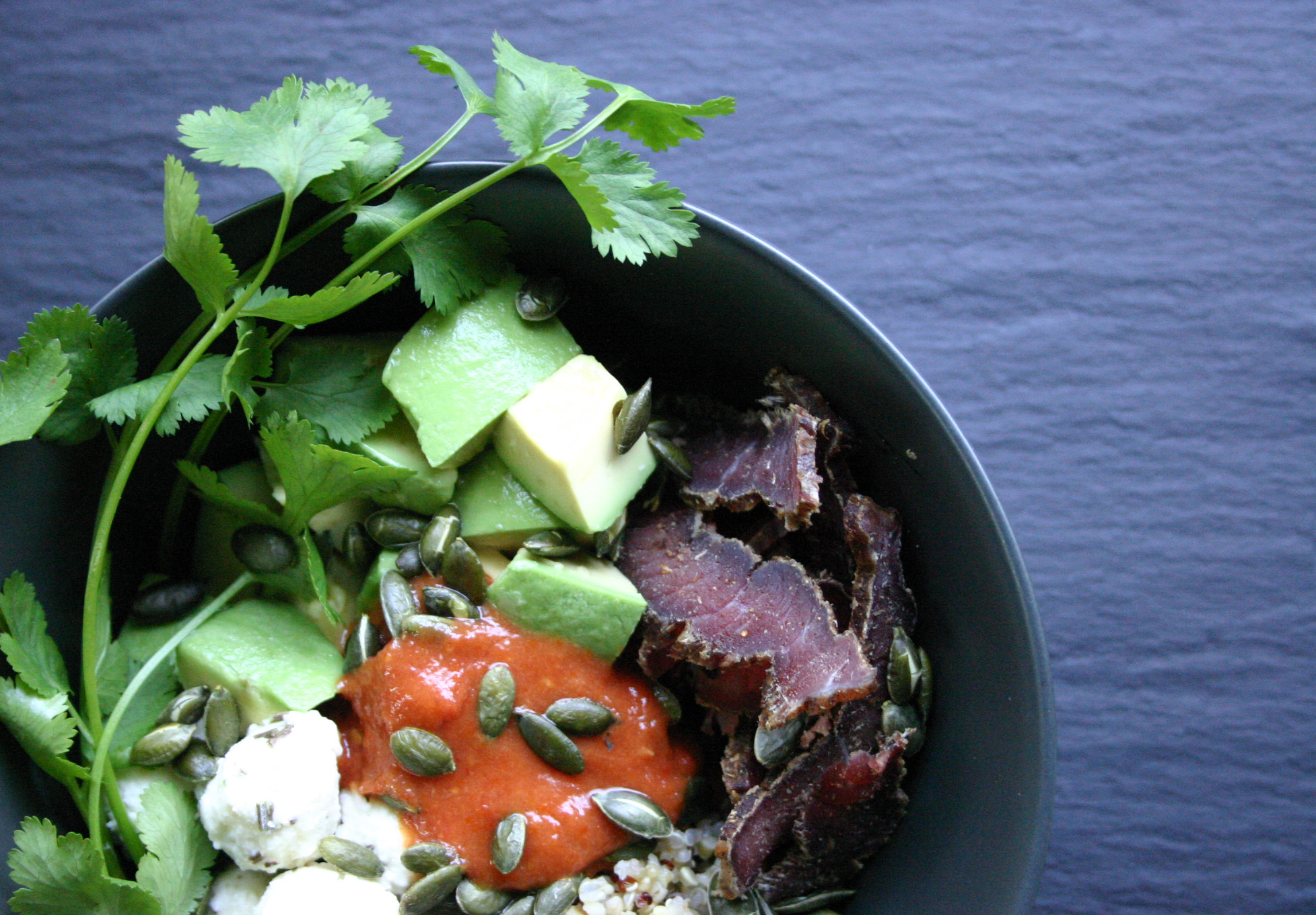 August 17, 2016August 17, 2016 TheGoodGreeff – Biltong bowl #1 with chevin cheese rounds, coriander, sundried tomato and pumpkin seeds