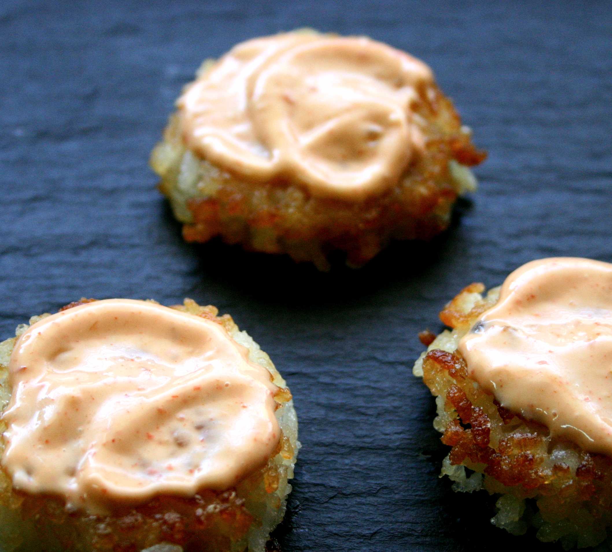 September 1, 2016September 1, 2016 Sushi pizza -golden brown rice patty bases with sirracha mayo dressing