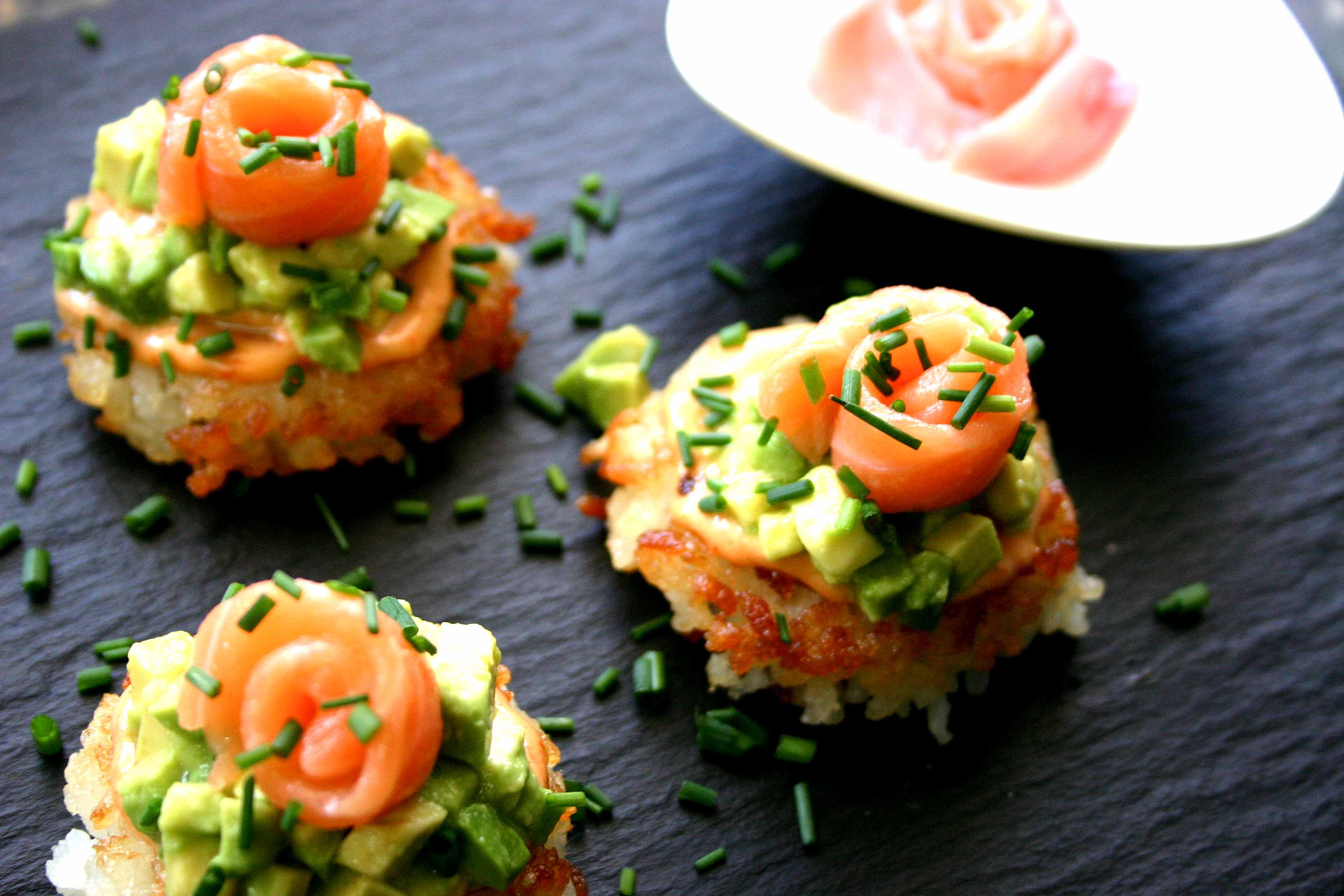 Sushi pizza – with sirracha-mayo, avocado and salmon