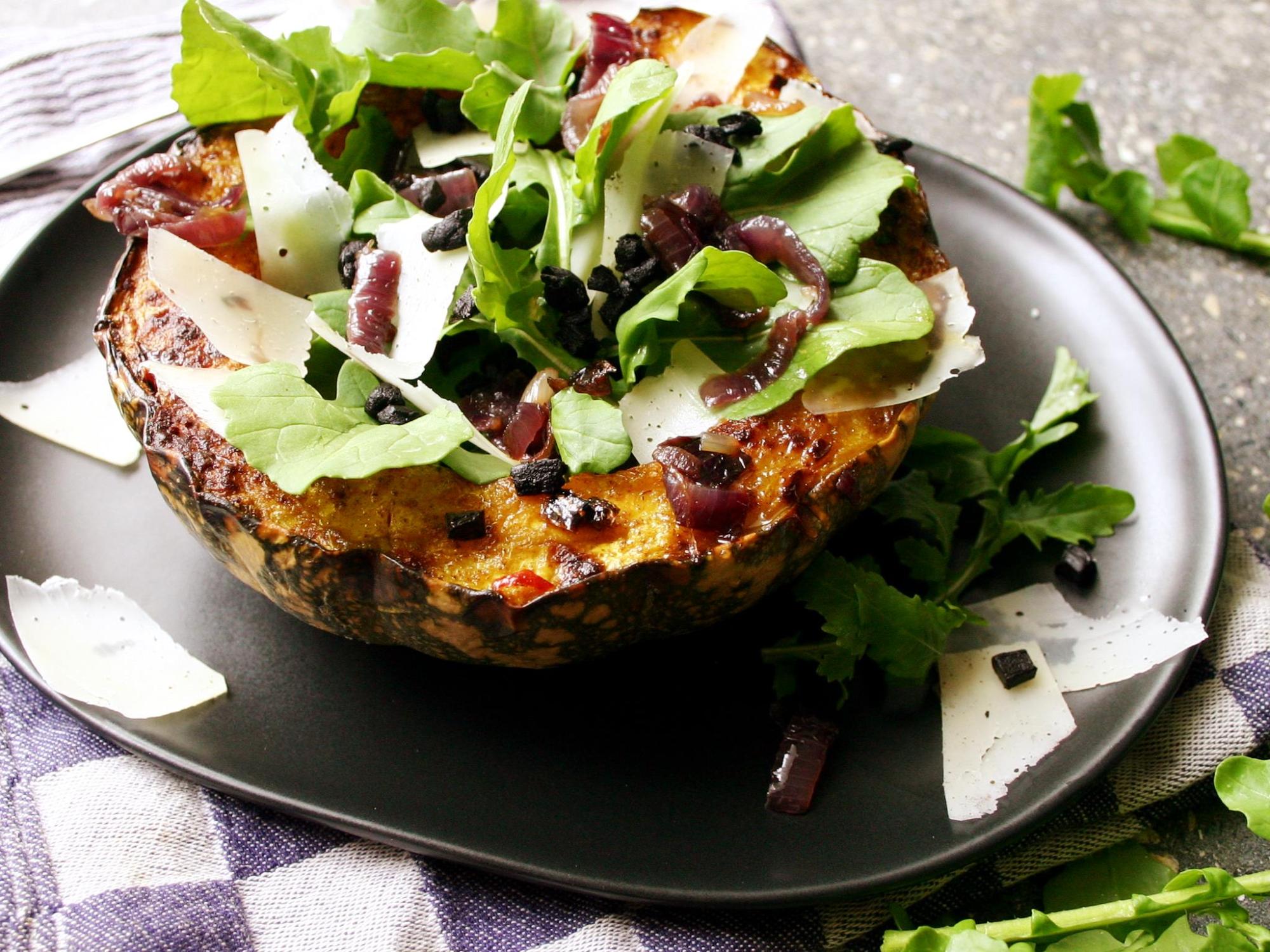 8. Mix fresh rocket, caramelised red onion, shaved hard cheese, and ⅔ black garlic, and spoon into pumpkin/ squash shell.
