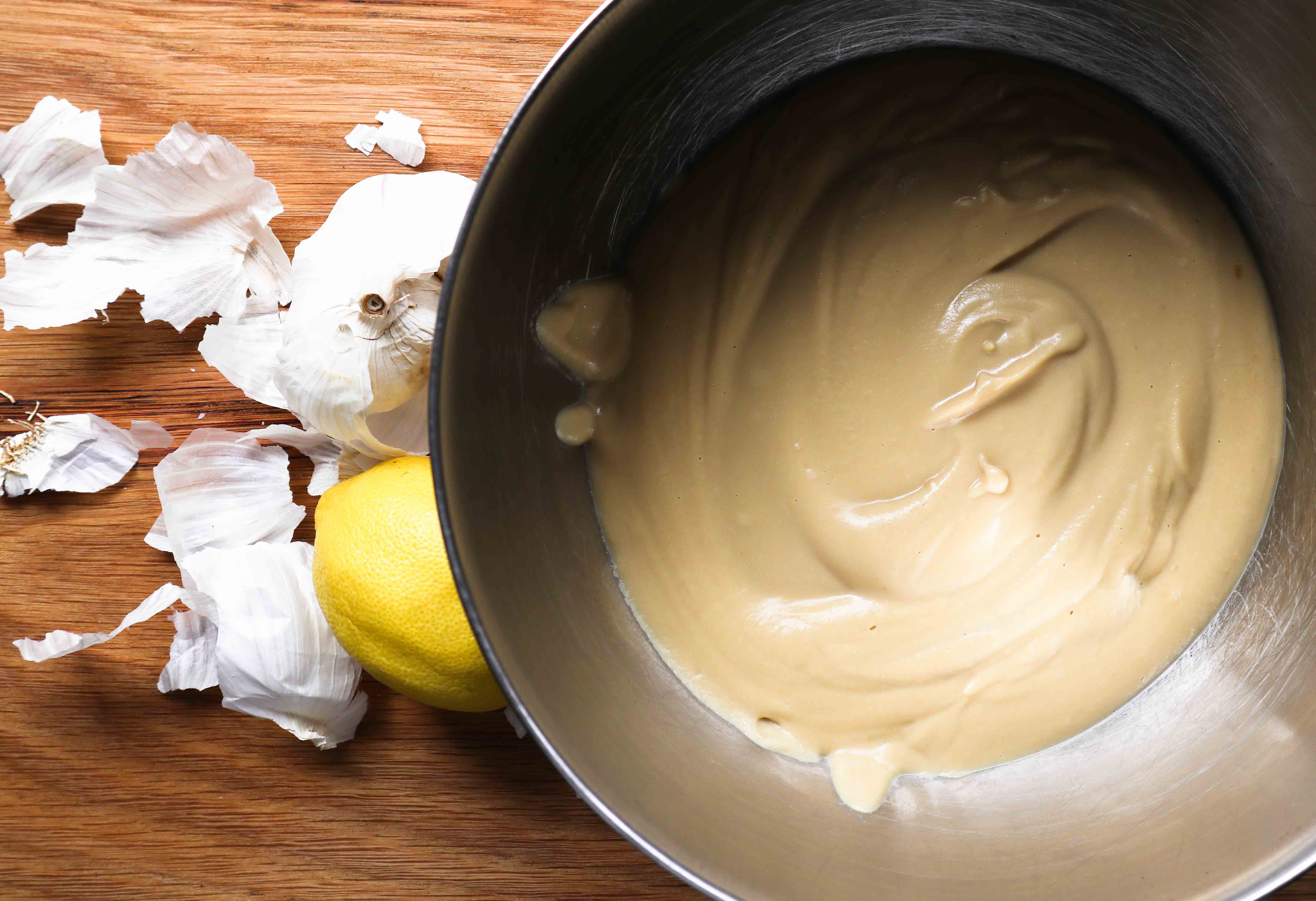 Chickpeas (Garbanzo Beans) boiled with carrot, bay leaves, onion and baking soda, then combined with lemon, garlic and tahini and blended while hot